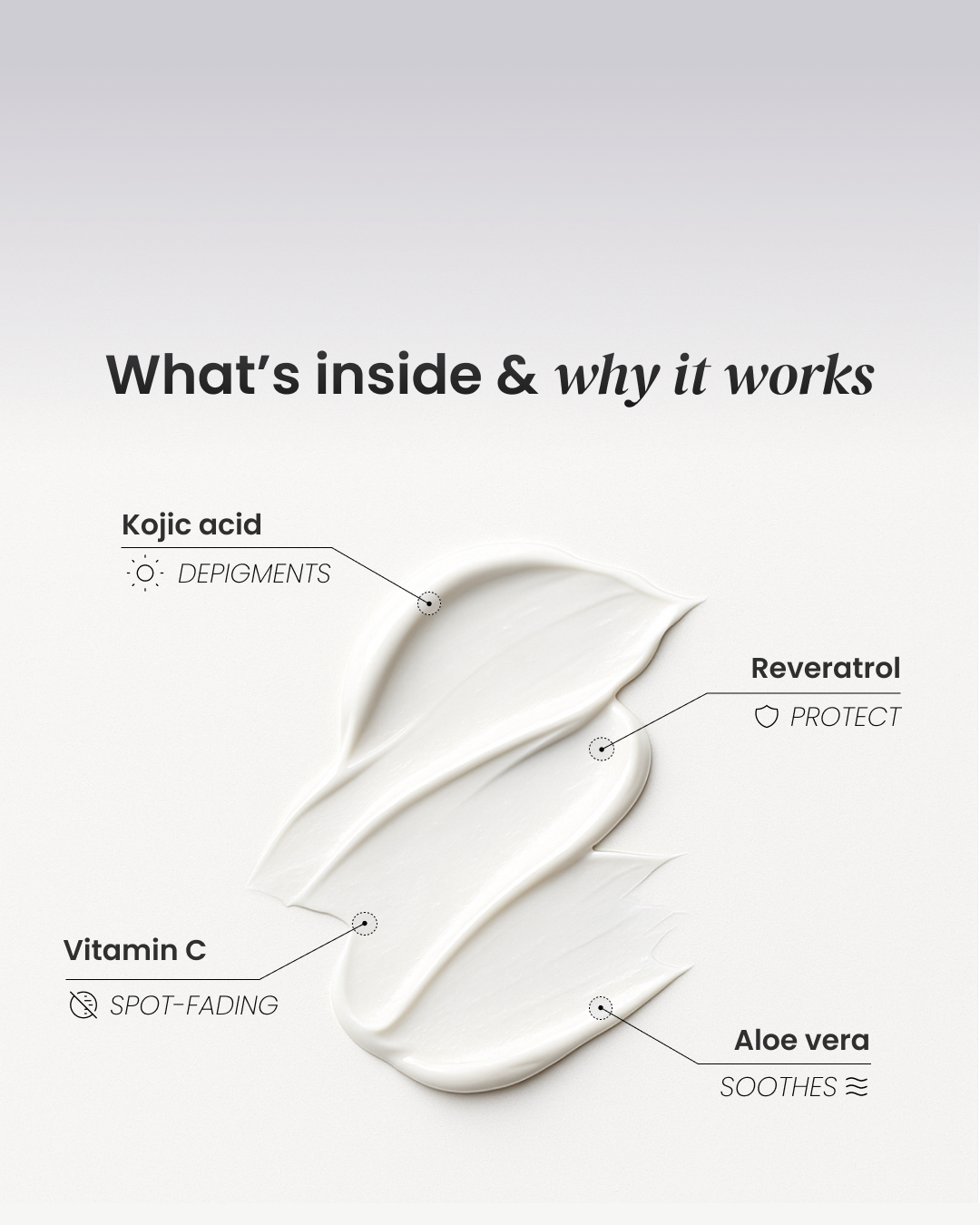 Whether it’s sun spots on your cheeks, melasma on your forehead, or discoloration on your neck, this powerful formula is designed to visibly brighten any problem area.